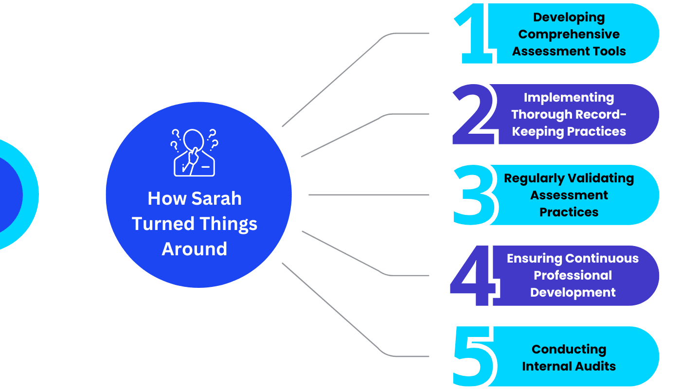 Sarah invested in high-quality, compliant assessment tools that were regularly updated to meet current standards. This ensured that their assessments covered all elements, performance criteria, and required knowledge and skills.